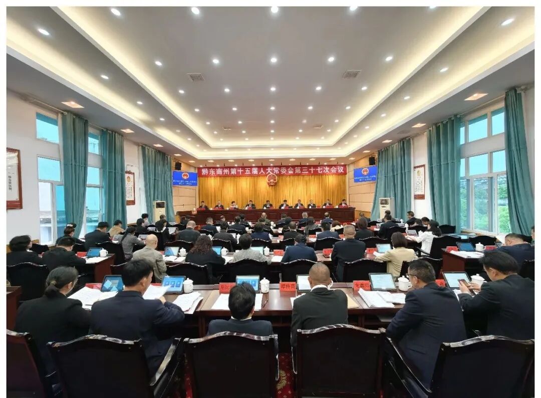 4月21日,黔东南州第十五届人大常委会第三十七次会议在凯里召开。州人大常委会党组书记、主任刘开树,州人大常委会副主任吴世胜、刘隆俊、陈正锋、罗青,秘书长高俊华,州人大常委会委员出席会议。