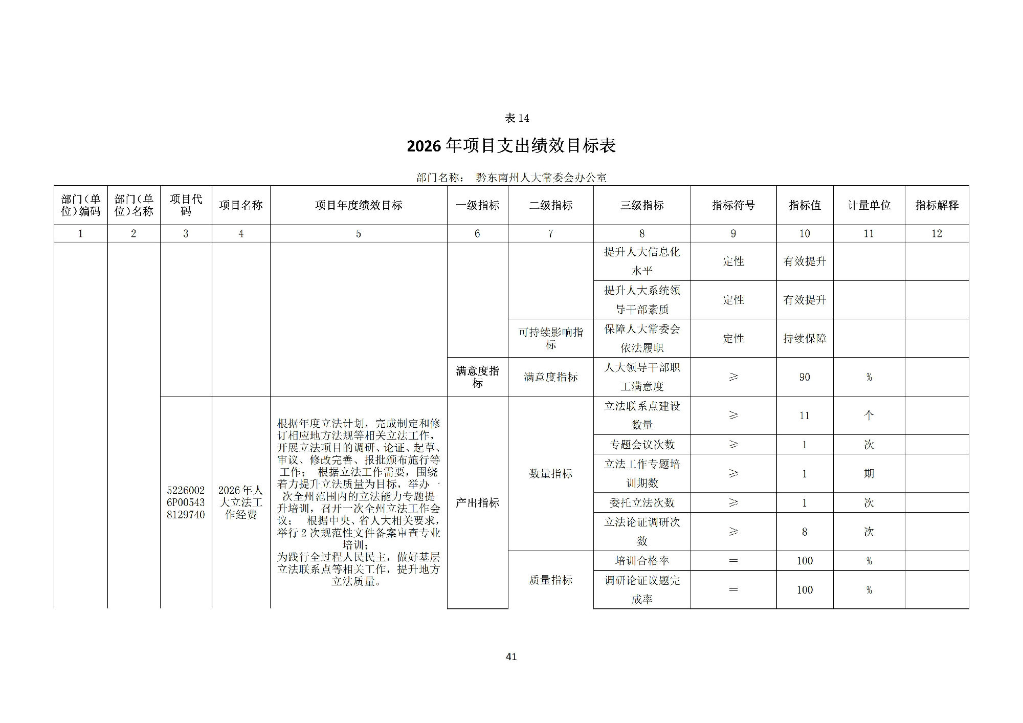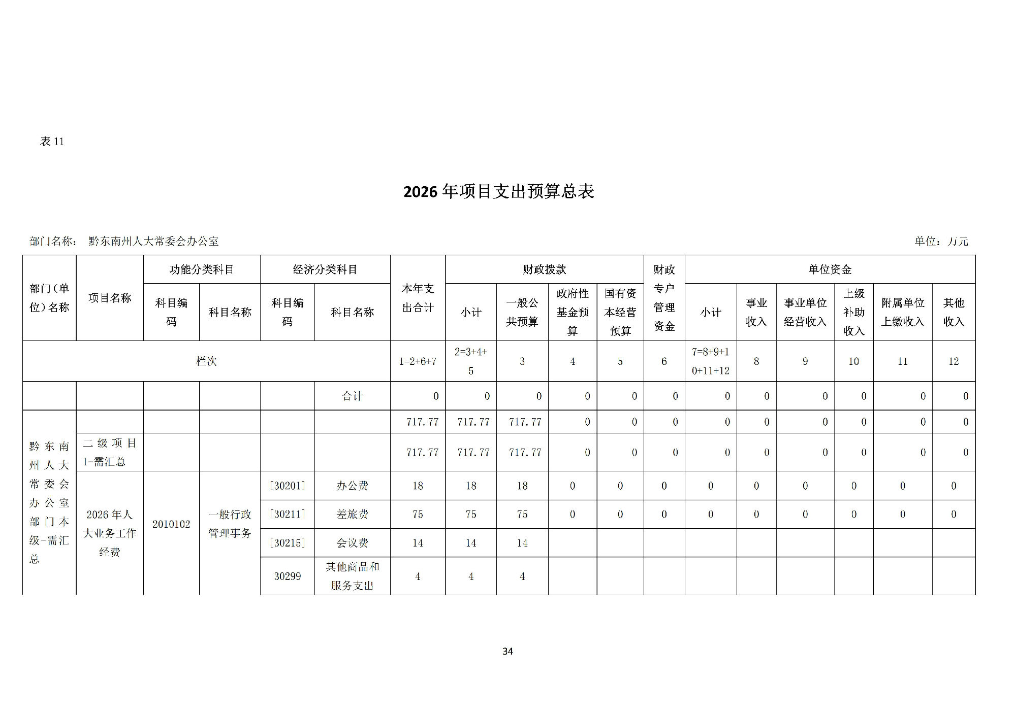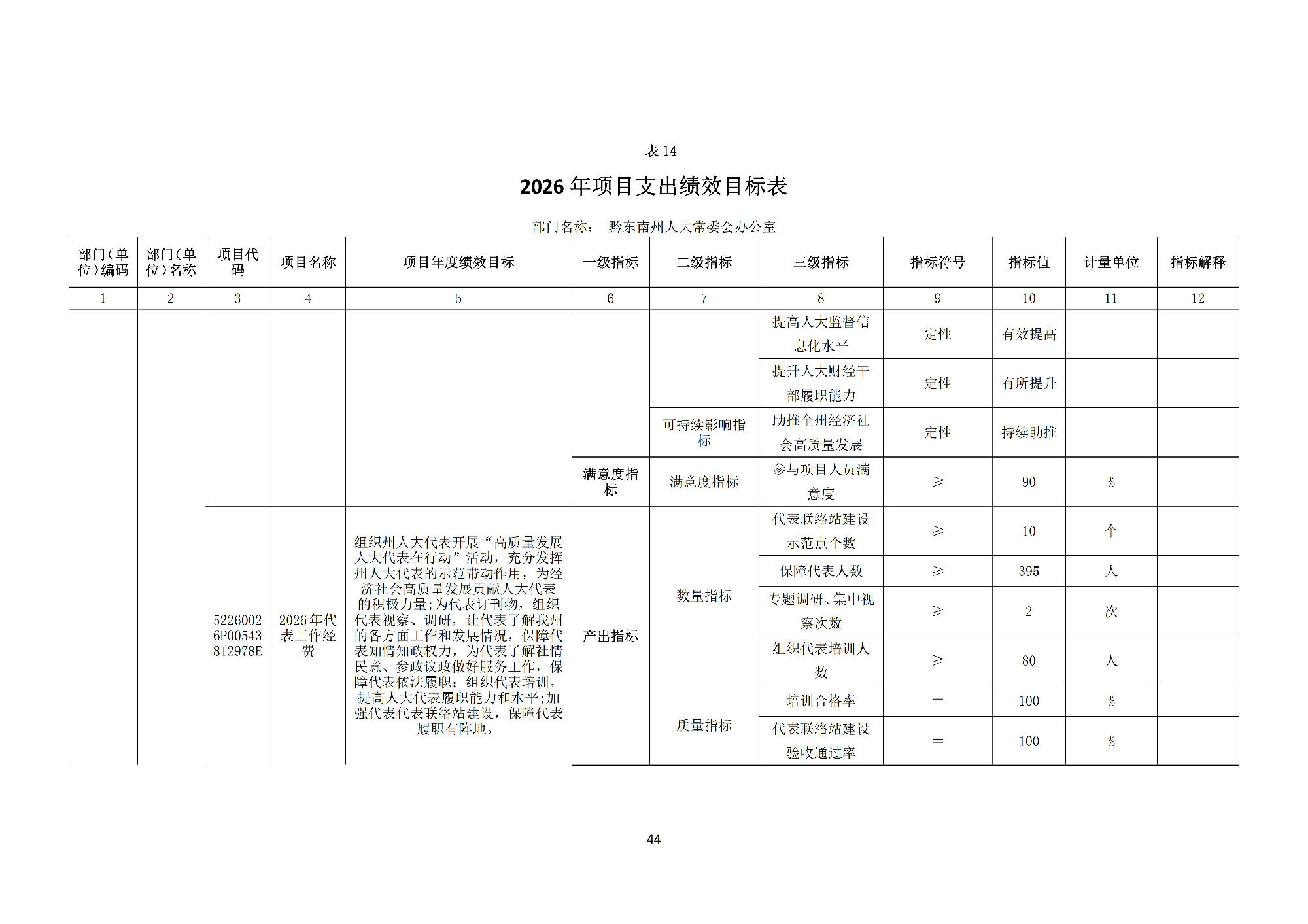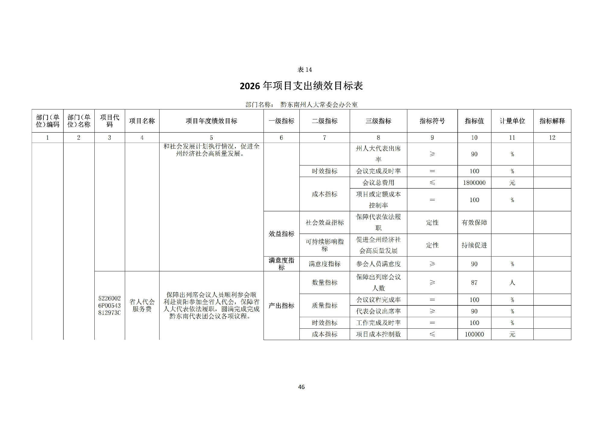 黔东南州人民代表大会常务委员会办公室2026 年部门预算公开信息
