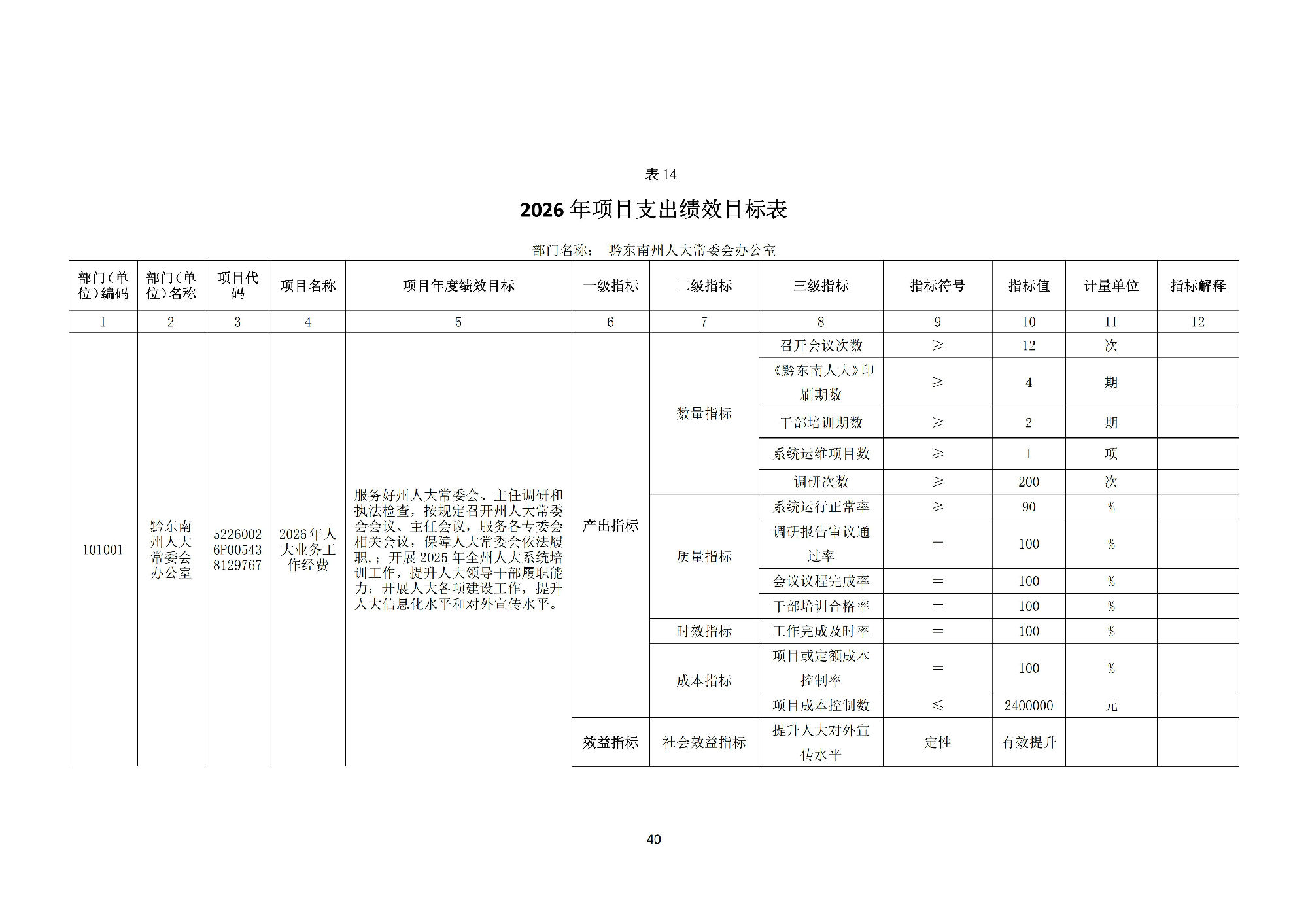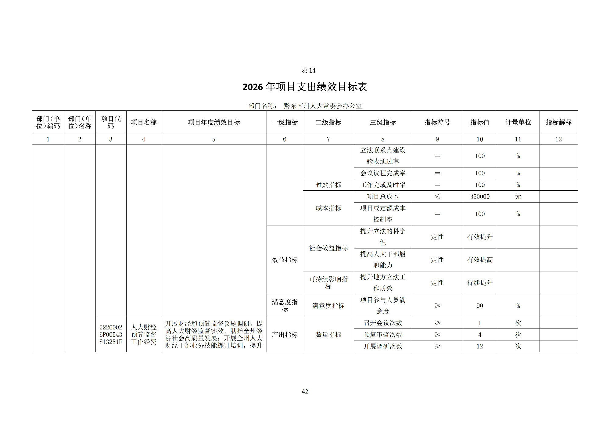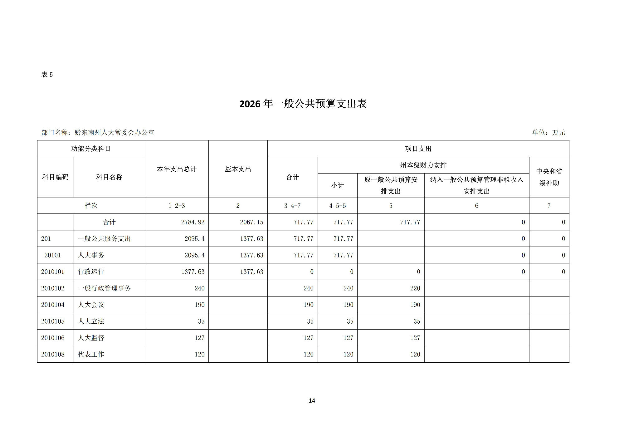 黔东南州人民代表大会常务委员会办公室2026 年部门预算公开信息
