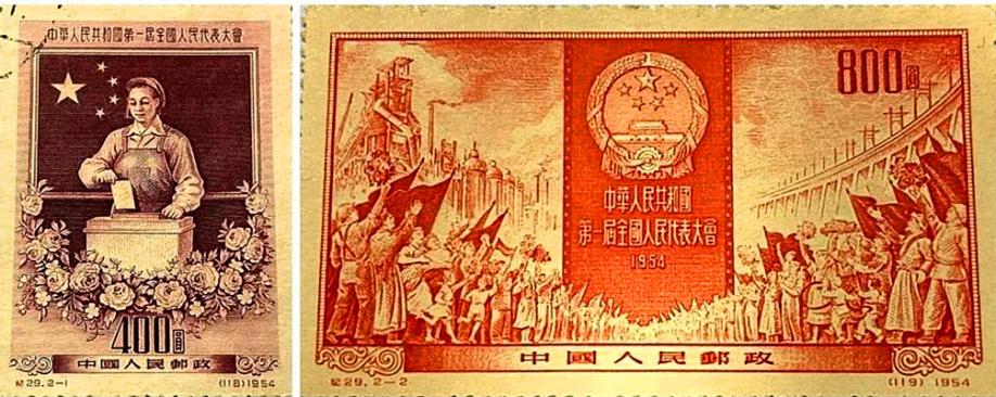 1954年9月,中南海怀仁堂,千余名人大代表肩负亿万华夏儿女的热切盼望,参加第一届全国人民代表大会第一次会议,审议通过《中华人民共和国宪法》,标志着人民代表大会制度这一国家根本政治制度正式建立。1954年12月30日,原邮电部发行《中华人民共和国第一届全国人民代表大会》邮票一套2枚(图1),邮票图案选取了第一届全国人民代表大会的两张宣传画。其中第1枚“普选”,展示的是基层选举的场面。画面为一个穿着工装的女工正在往票箱中投选票,背景是中华人民共和国国旗;第2枚“庆祝全国人民代表大会”, 画面展示的是各族人民庆祝第一届全国人民代表大会召开的情景,邮票中央为中华人民共和国国徽,两边是庆祝的人群。设计者特意采用了红色作为整枚邮票的基本色调,以衬托出热烈喜庆的气氛。
