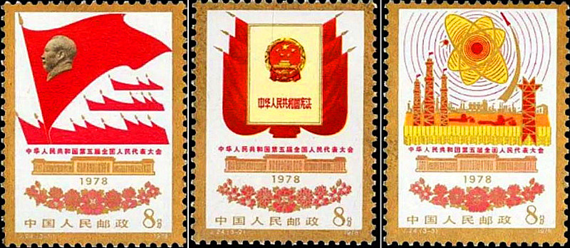 1978年2月26日,第五届全国人大召开。这是我国粉碎“四人帮”后召开的人大会议。中国邮政于当日发行《中华人民共和国第五届全国人民代表大会》纪念邮票一套3枚(图3),图案为“高举毛主席的伟大旗帜,把无产阶级革命事业进行到底”、“人民的宪法”和“一定要实现四个现代化”。