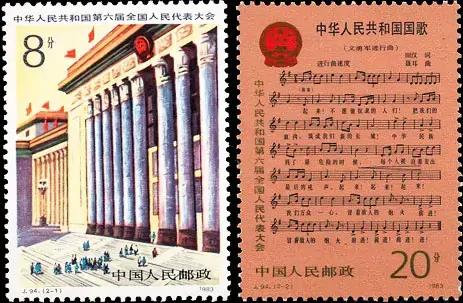 1983年6月6日,中国邮政发行《中华人民共和国第六届全国人民代表大会》纪念邮票一套2枚(图4),图案为“中华人民共和国第六届全国人民代表大会第一次全体会议隆重召开”和“中华人民共和国国歌”。