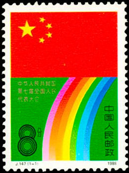 1988年3月25日,中国邮政发行《中华人民共和国第七届全国人民代表大会》纪念邮票一套1枚(图5)。邮票上部是一面五星红旗,下方则用奔放的线条勾勒出一条七色彩虹。二者巧妙的组成一个“7”字,主题鲜明突出。