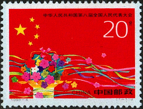 1993年3月15日,中国邮政发行《中华人民共和国第八届全国人民代表大会》纪念邮票一套1枚(图6),图案为一面庄严的五星红旗,国旗前为花篮与飘扬的彩带。