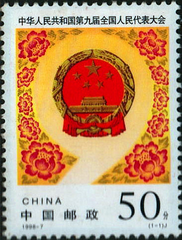1998年3月5日,中国邮政发行《中华人民共和国第九届全国人民代表大会》纪念邮票一套1枚(图7),邮票图案中间为庄严的国徽,周围为盛开的大小相间的十朵牡丹花,国徽与牡丹花之间留白的地方形成一个“9”字,代表第九届全国人民代表大会。