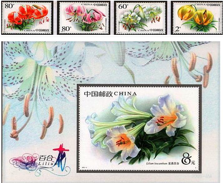 第十届全国人民代表大会于2003年3月5日在北京召开,中国邮政虽然未按惯例为这届大会发行纪念邮票,但在开幕当天发行了《百合花》特种邮票一套4枚和小型张1枚(图8)。百合花是我国人民喜爱的吉祥花卉,以此来象征百事合心、团结友好,则蕴涵祝福大会吉祥如意,百事合意;同时寓意着跨入小康社会的全国各族人民,在中国共产党的领导下百折不挠,齐心合力,奔向美好的未来。