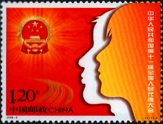2008年3月5日,中国邮政发行《中华人民共和国第十一届全国人民代表大会》邮票一套1枚(图9)。邮票在设计上采用一男一女形象代表全国人民;面朝国徽,代表团结一致;底图采用连续心形,代表万众一心。整体寓意:全国人民团结一心在党中央领导下走向更加美好的明天。
