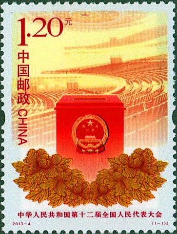 2013年3月5日,中国邮政发行《中华人民共和国第十二届全国人民代表大会》邮票一套1枚(图10),图案为牡丹花簇拥下,象征人民行使权力印有中华人民共和国国徽的红色投票箱,背景画面为人民大会堂礼堂。