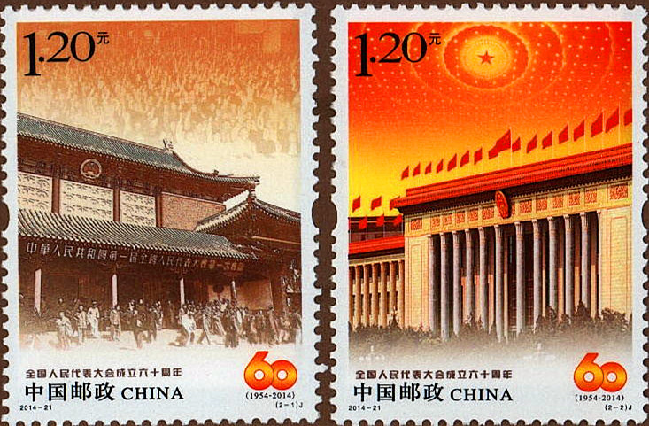 2014年9月15日,中国邮政发行《全国人民代表大会成立六十周年》纪念邮票一套2枚(图14)。邮票设计简洁、主题突出,画面以全国人民代表大会会议主会场和艺术数字“60”等为表现元素,寓意全国人民代表大会走过的光辉历程,并正在不断与时俱进。邮票第一图以第一届全国人民代表大会第一次会议主会场中南海怀仁堂的外景为主要内容,背景是大会表决通过有关决议的历史瞬间,画面色调古朴典雅、庄重严肃,具有厚重感;邮票第二图为人民大会堂,背景突出了人民大会堂万人大礼堂的内景穹顶,寓意中国共产党是中国特色社会主义事业的领导核心,画面庄严雄伟、壮丽典雅。