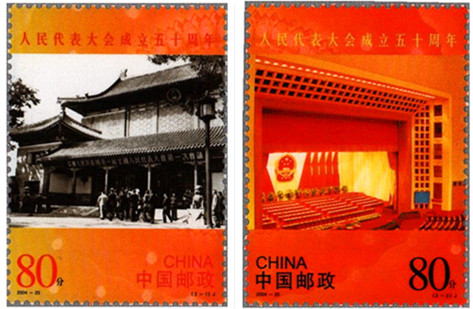 2004年9月15日,中国邮政发行《人民代表大会成立五十周年》纪念邮票一套2枚(图13),邮票内容分别为“一届全国人大一次会议在中南海怀仁堂举行”和“庄严的人民大会堂主席台”。