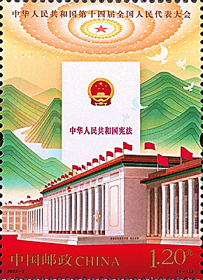 2022年3月5日, 中国邮政发行《中华人民共和国第十四届全国人民代表大会》纪念邮票一套1枚(图12),邮票画面以北京人民大会堂以及《中华人民共和国宪法》封面为主体形象,背景表现了锦绣山河,象征广大人民群众,寓意在党的领导下我国的人民代表大会制度不断巩固和发展,整体画面简洁、庄重、大气,体现出宪法的崇高地位。