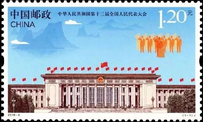 2018年3月5日,中国邮政发行《中华人民共和国第十三届全国人民代表大会》纪念邮票一套1枚(图11)。邮票设计严谨有序,画面视野开阔,气势不凡。雄伟的人民大会堂、闪亮的国徽和飘扬的红旗构成了画面的前景;画面中景采用了剪影的手法表现了宪法宣誓仪式,寓意我国的人民代表大会制度不断完善和发展;远景中的山水画面构图简洁、色彩明朗,寓意我国经济发展必须树立和践行绿水青山就是金山银山的理念。